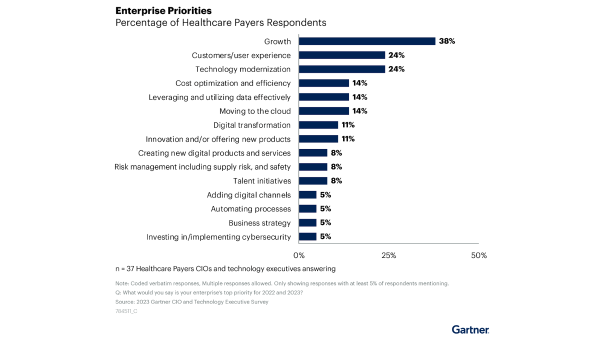 In fact, as Gartner found in their survey, 2023 CIO and Technology Executive Survey, these three strategic imperatives are common to every health plan.